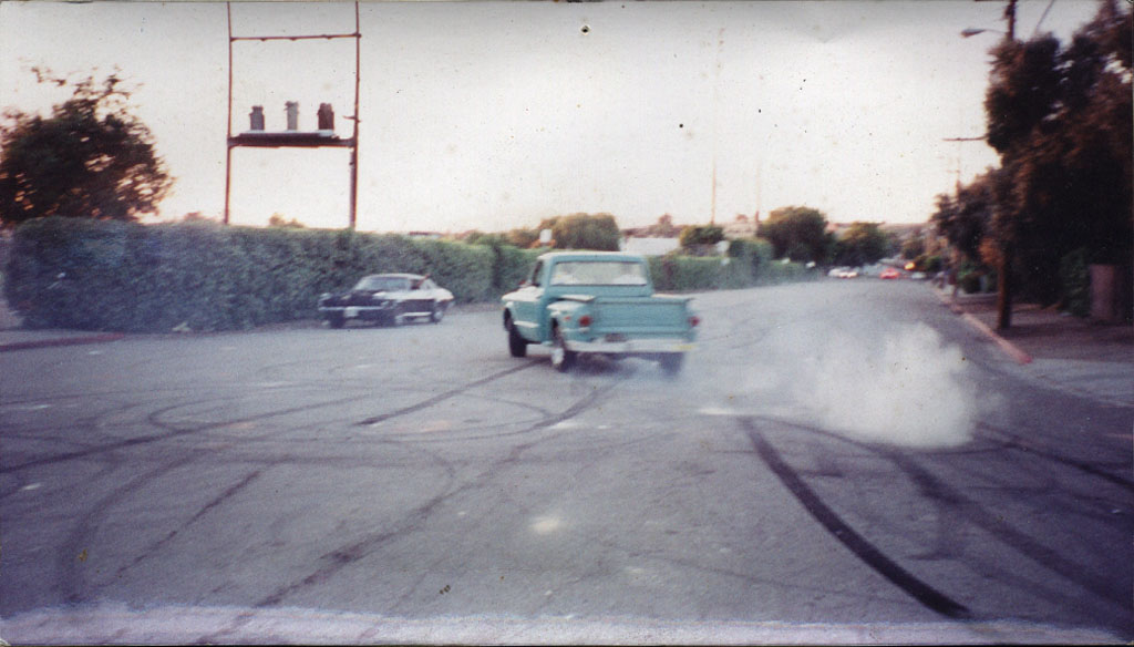 Greg's truck, in the background you can see Jason's Cougar, and that's me taking a picture of Greg doing donuts!